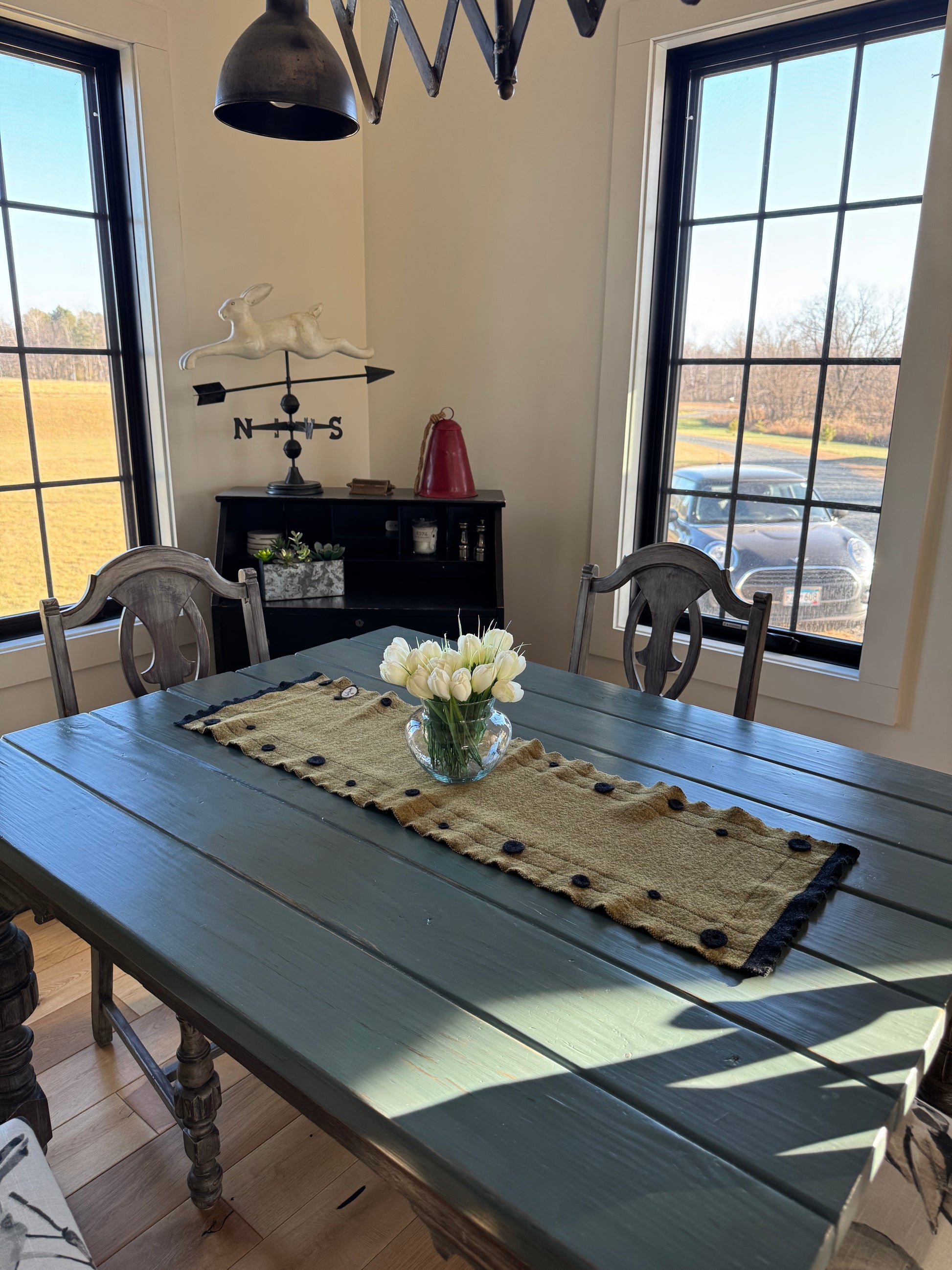 Prairie (hints of gold and green) wool runner perfect for holiday decorating! Approximate size 12” w x 38” long.